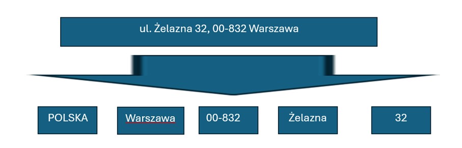 Dane jak: Kraj, Miasto, Ulica, Kod pocztowy, Numer budynku będą miały osobne pola